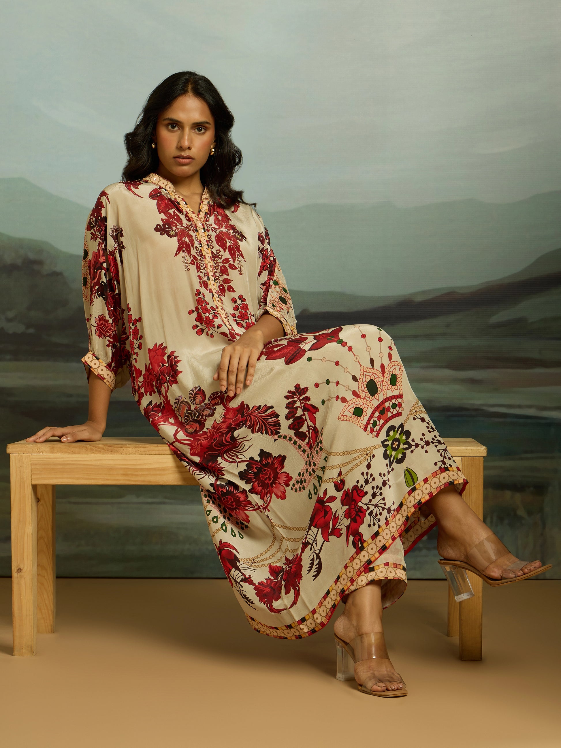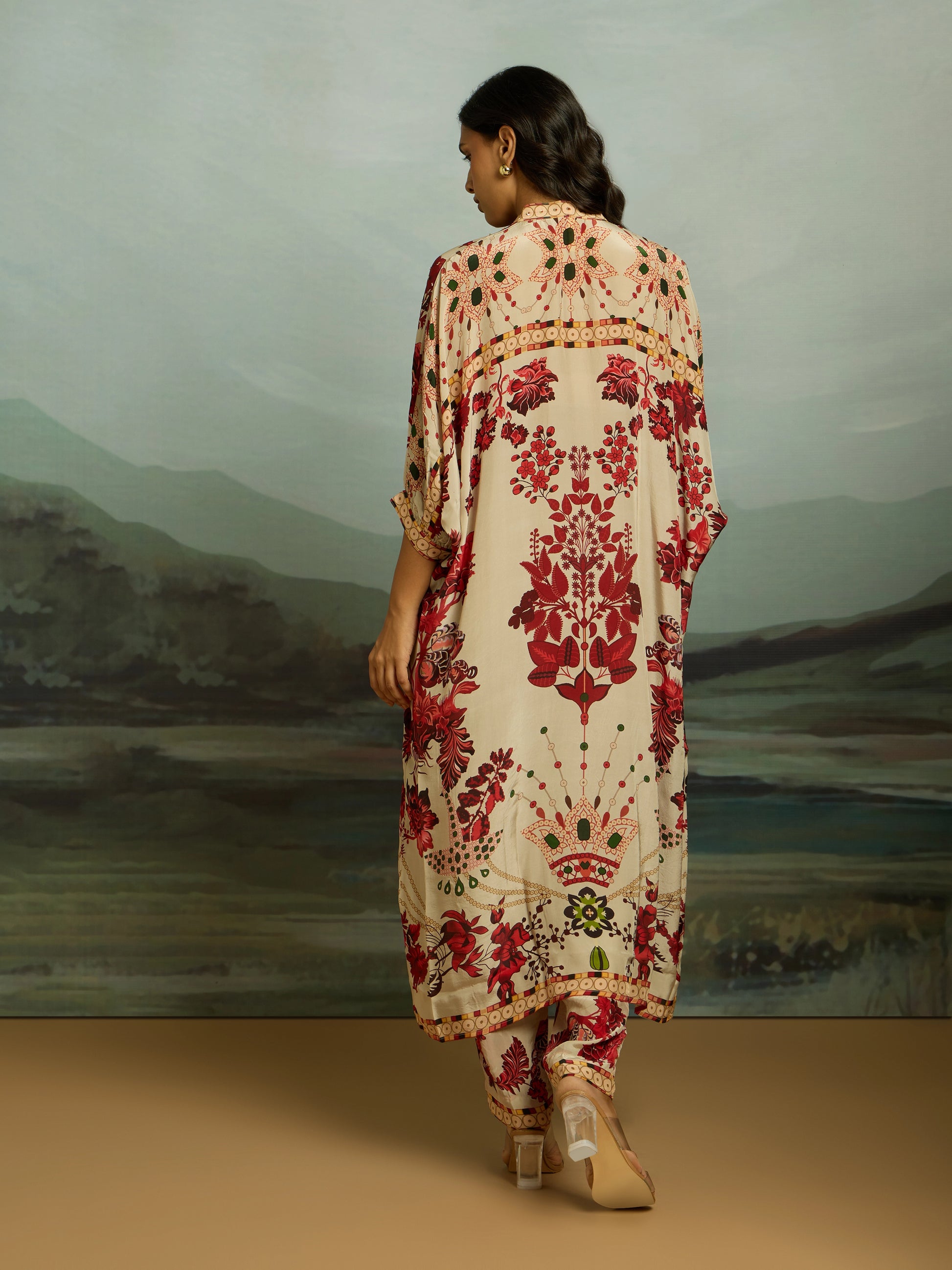 Step into statement elegance with this ivory printed kurta set, drenched in rich botanical motifs in shades of crimson, maroon, and soft green. The flowy silhouette features a relaxed fit with a gently curved hem, complemented by intricate neckline detailing that adds a touch of artisanal charm. Paired with matching printed trousers, the ensemble creates a seamless, head-to-toe floral story. Effortless yet striking, this set is perfect for festive gatherings, vacation evenings, or days when you want to radiate easy sophistication with bold, artistic flair.