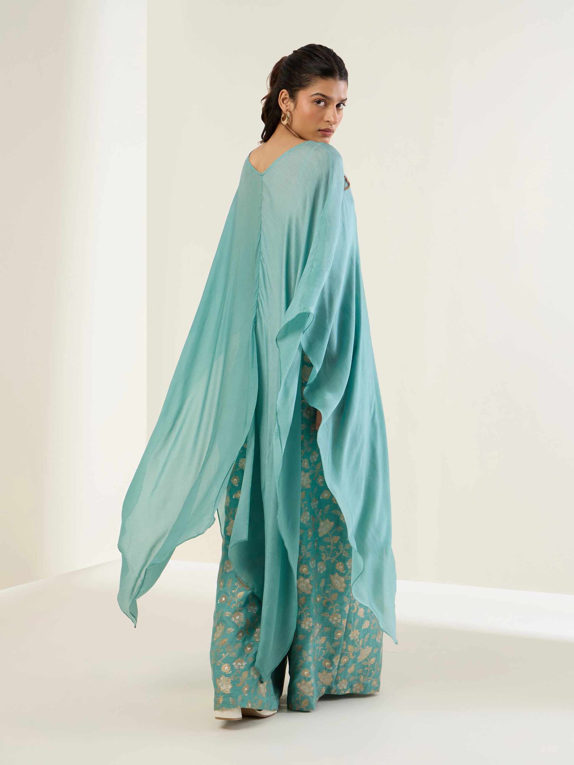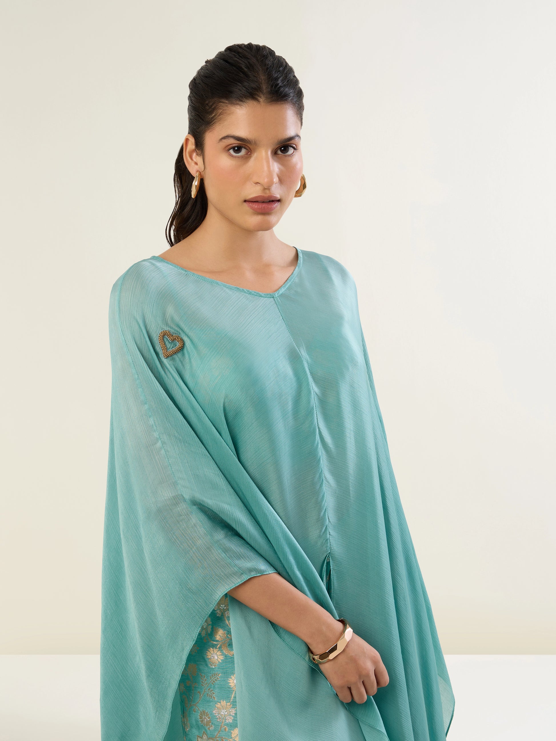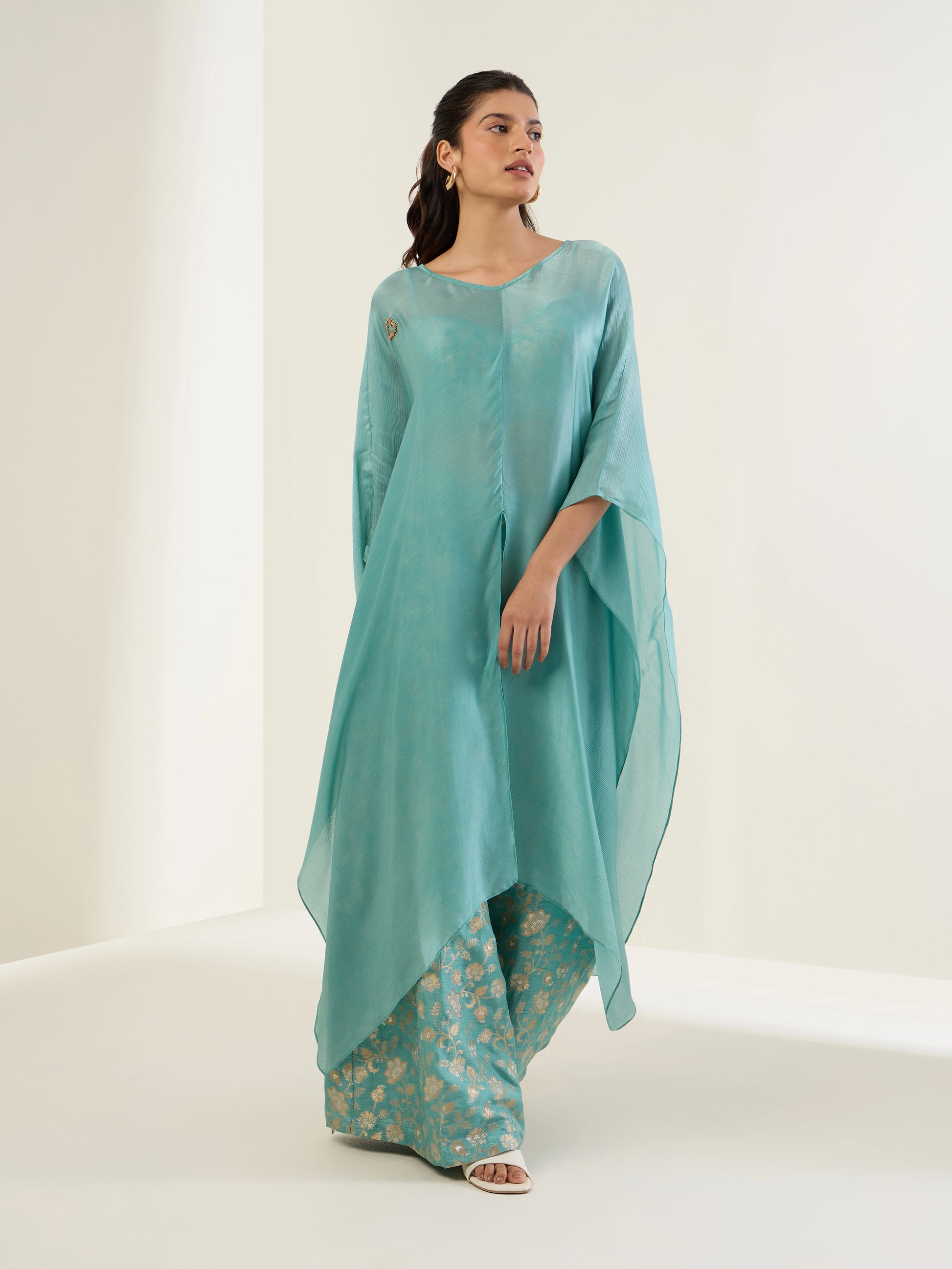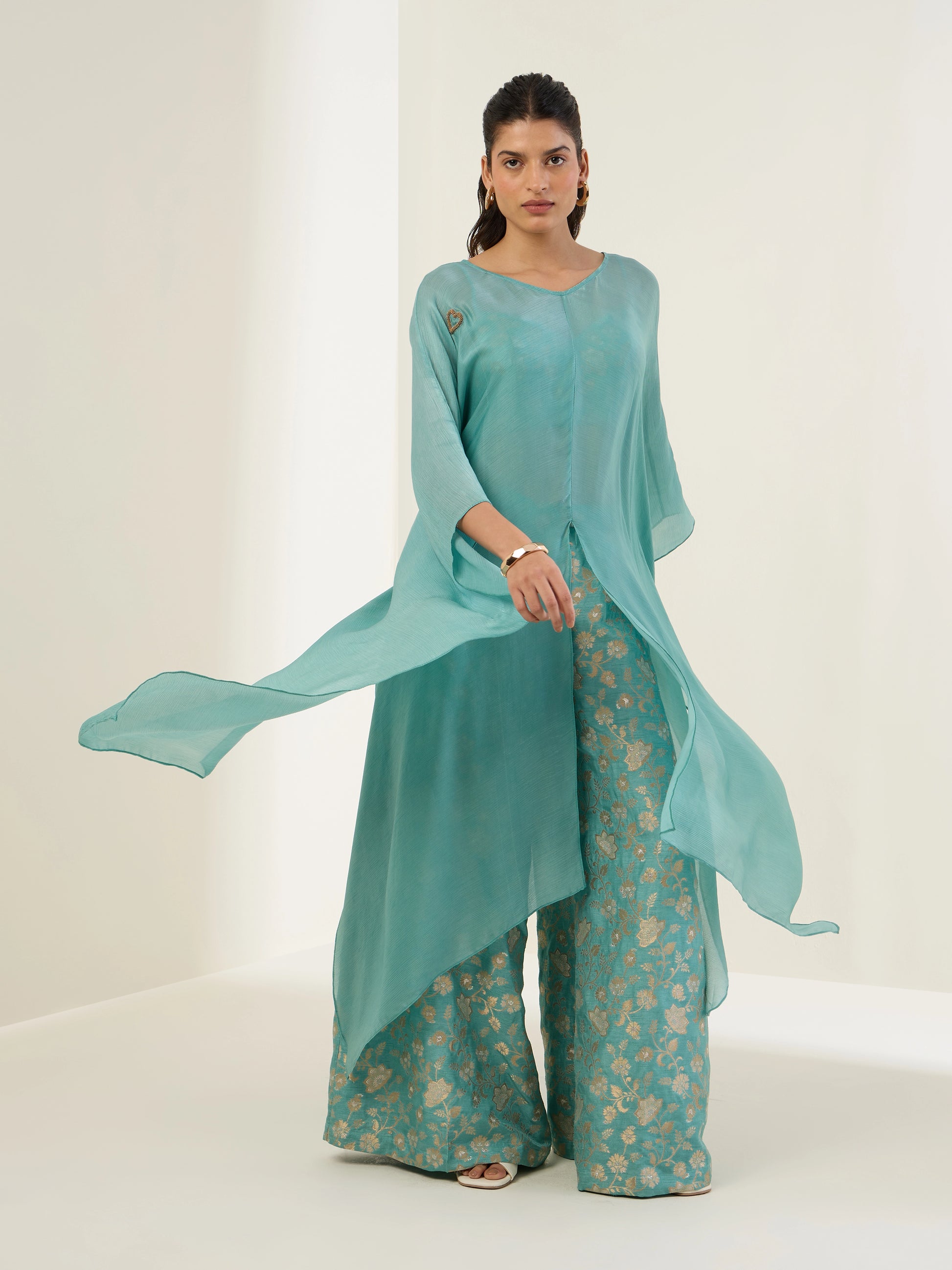 Breathe easy elegance in this serene aqua asymmetrical kurta set, crafted in a fluid, lustrous fabric that moves beautifully with every step. The kurta features a soft drape with a high–low hemline, relaxed sleeves, and a clean, minimal silhouette accented by a subtle embroidered motif near the shoulder for just a hint of embellishment. Paired with brocade-inspired wide-leg pants woven with delicate gold motifs, the ensemble blends simplicity with quiet luxury. Perfect for intimate festivities, summer soirées, or refined daytime events, this set offers comfort, sophistication, and effortless charm in one graceful look.