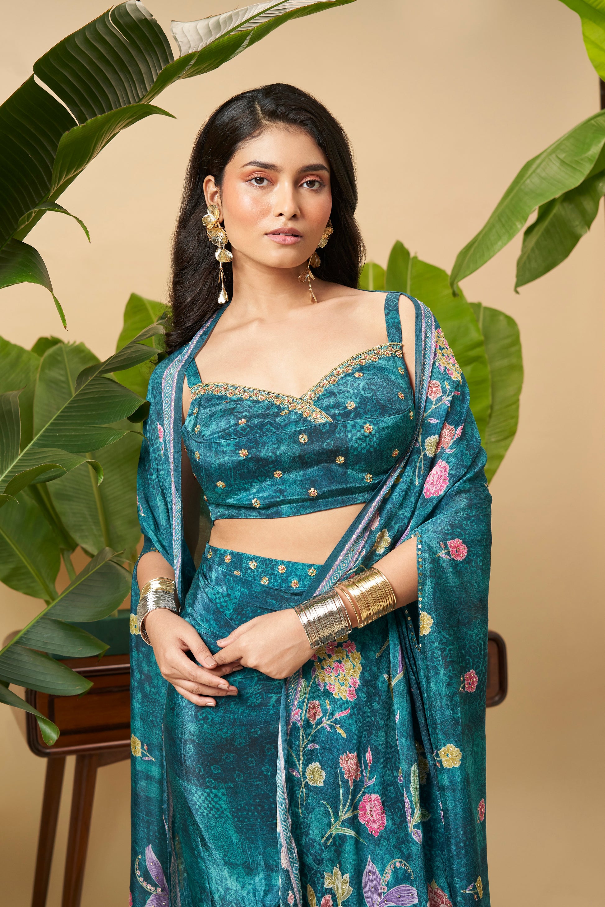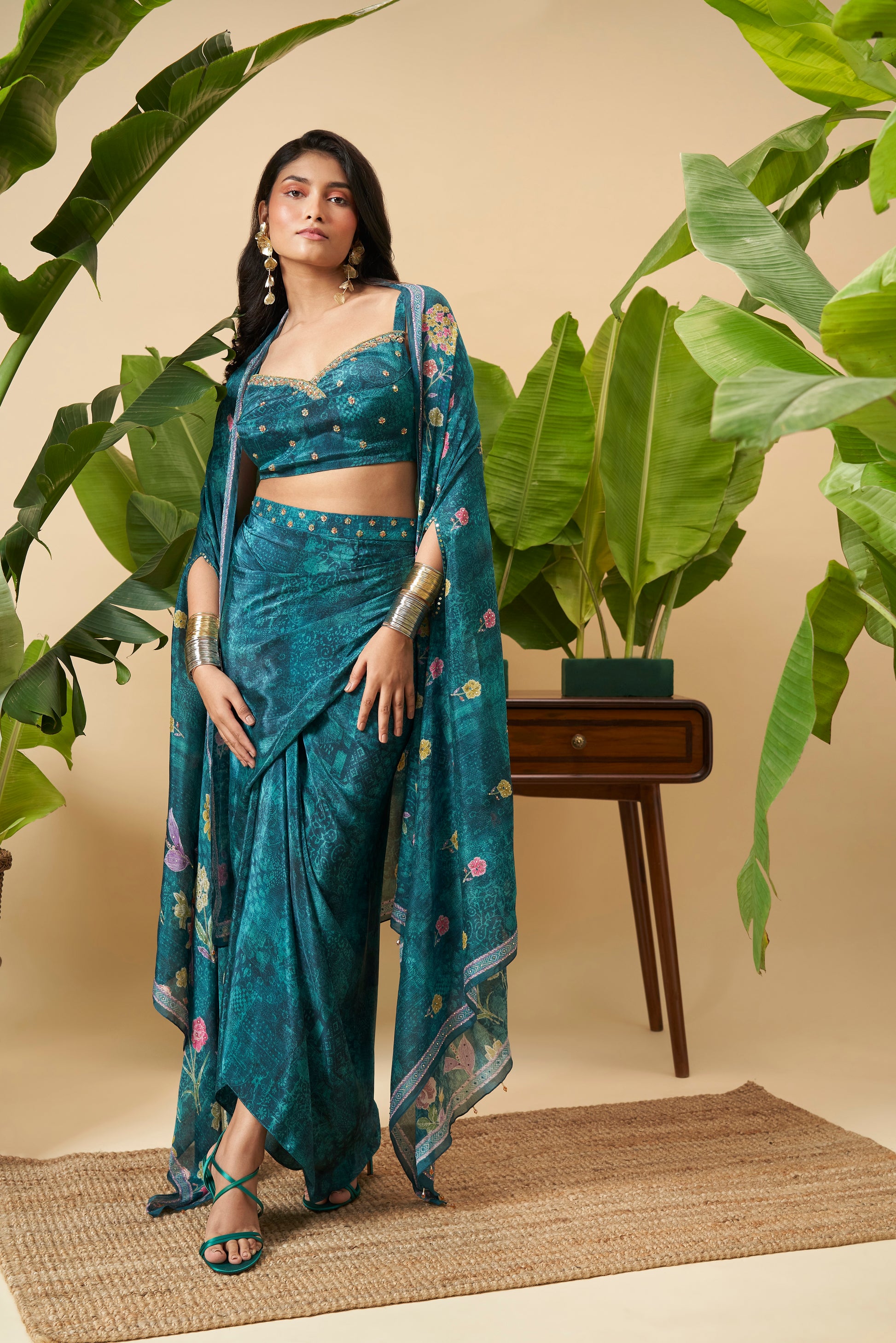 Pure crepe draped skirt set with a raw silk top, hand embroidery, and a Chinon cape. Ideal for festive events, blending Indian elegance with modern style.