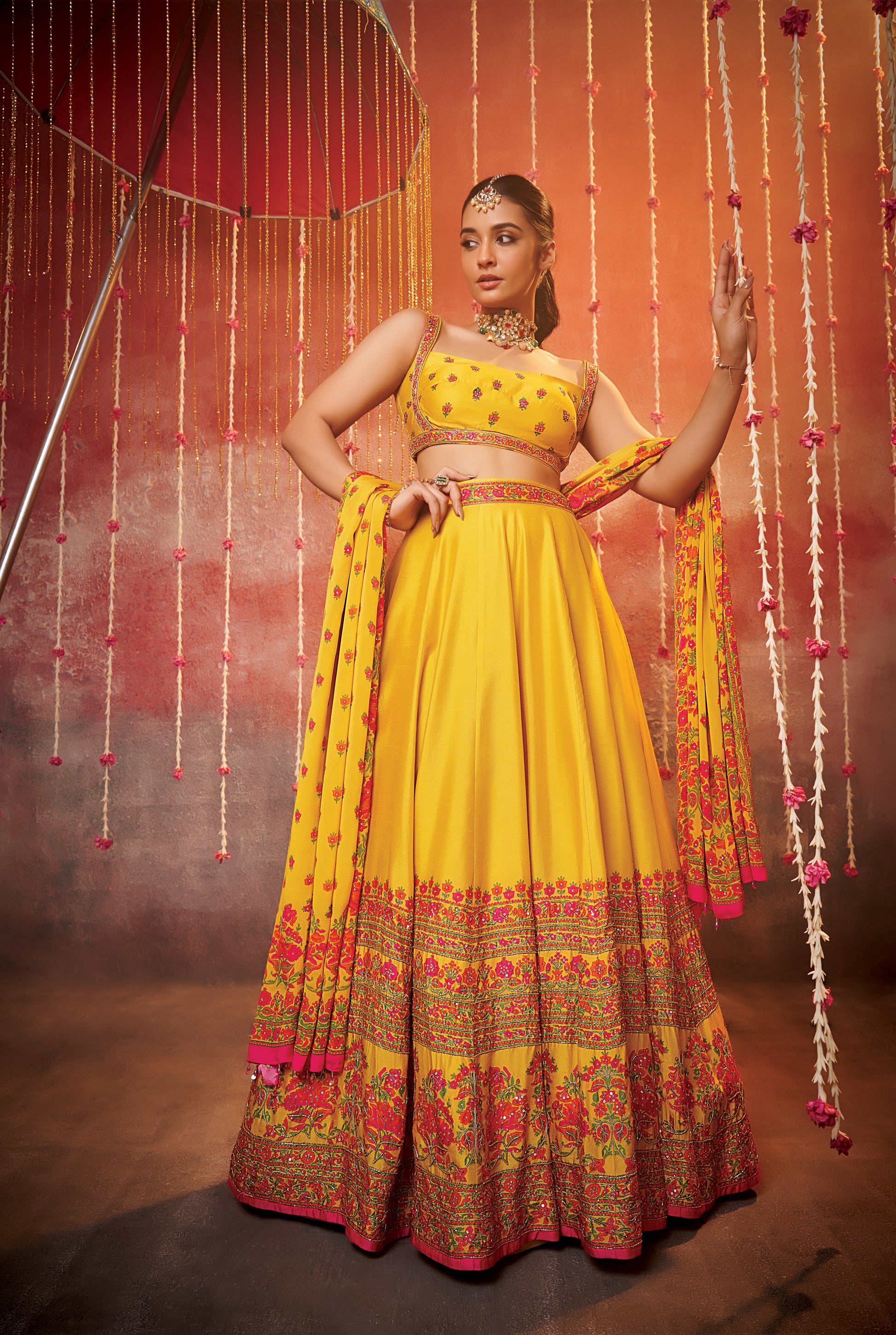 Featuring a mustard yellow lehenga in raw silk base with floral digital print and hand embroidery, including a can-can, side zip closure and side pockets. It is paired with a square neck blouse and a chinon printed dupatta. Accentuate it with statement jewellery and heels for a wedding or haldi ceremony.