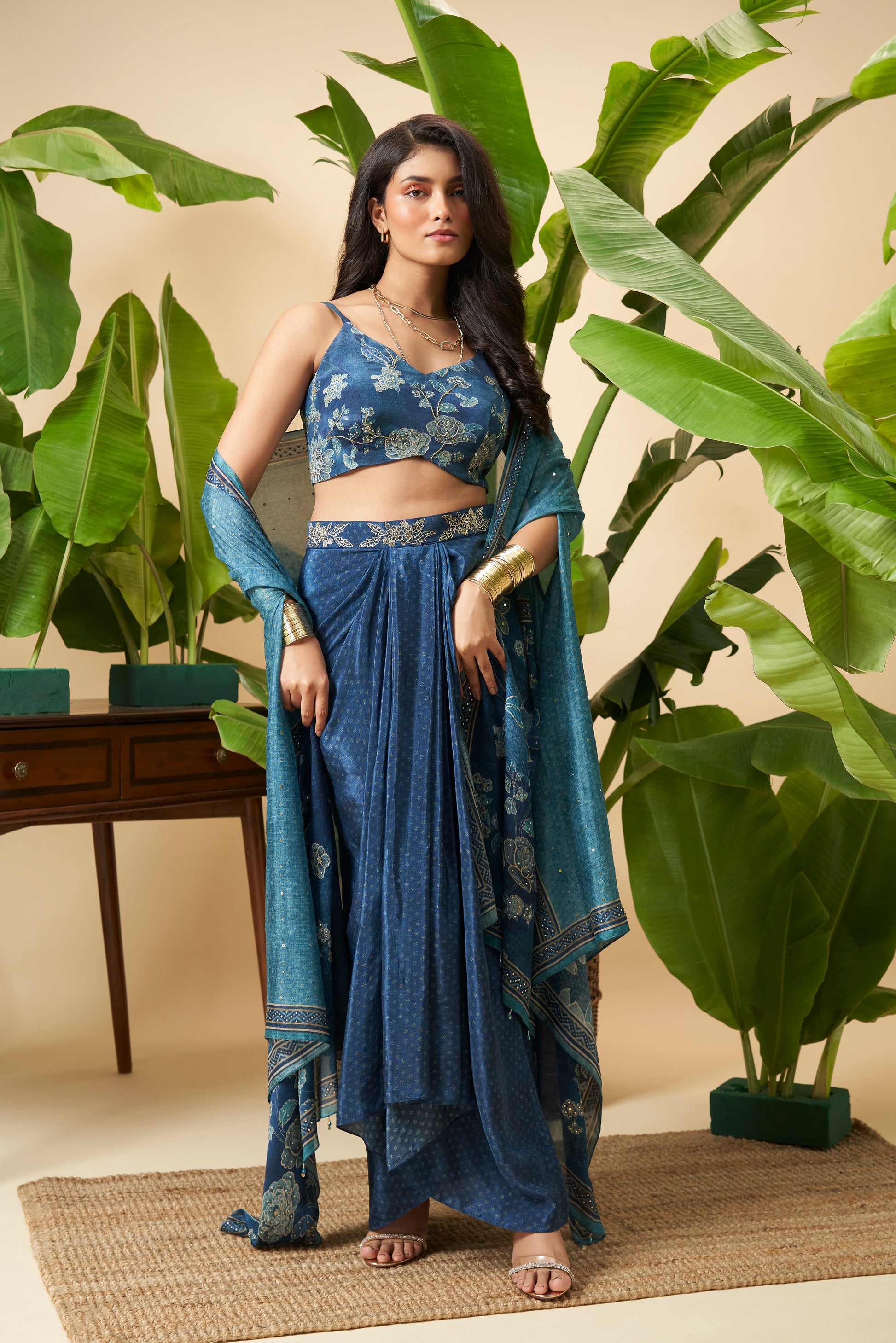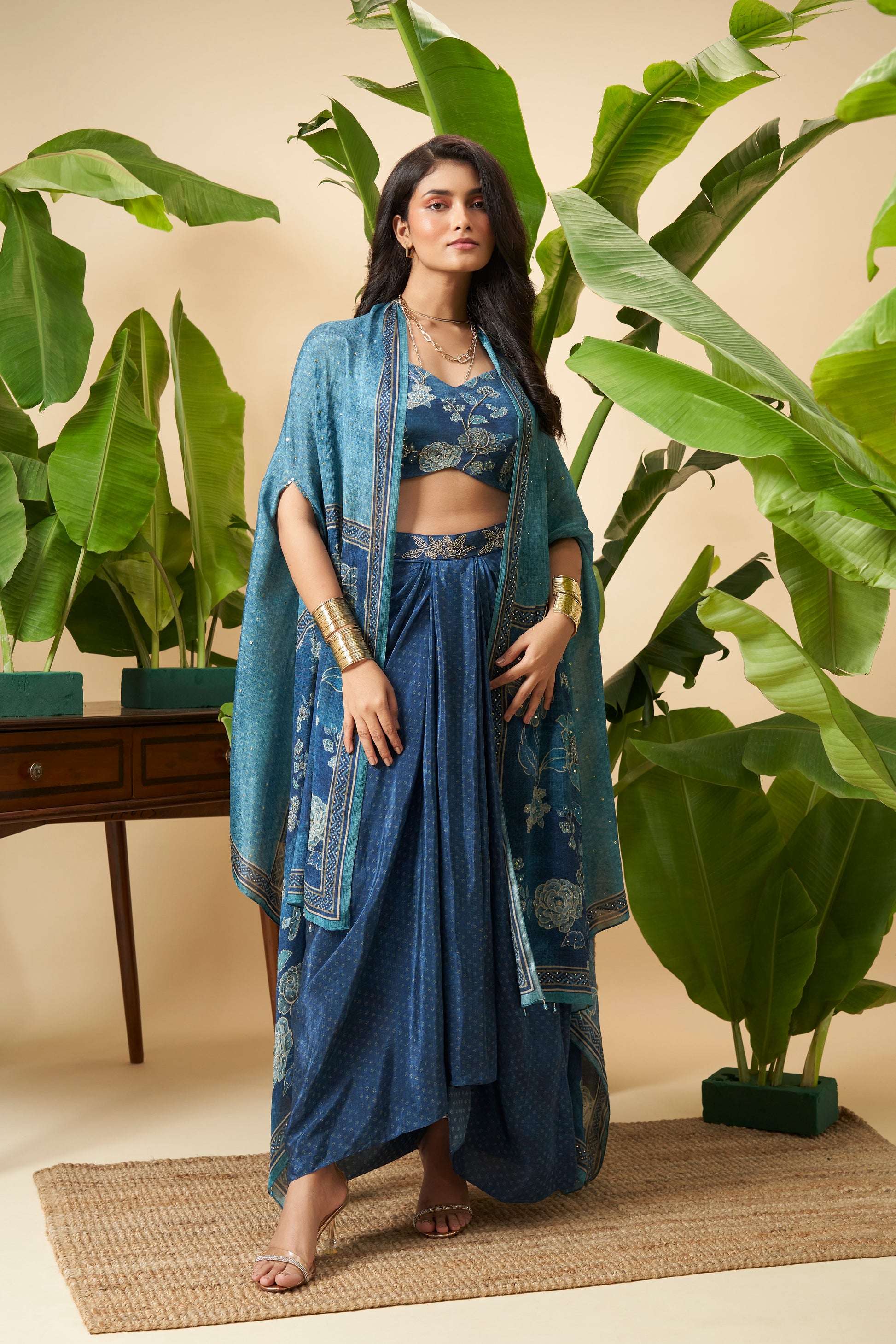 Pure crepe draped skirt set with a raw silk top, hand embroidery, and a Chinon cape. Ideal for festive events, blending Indian elegance with modern style.