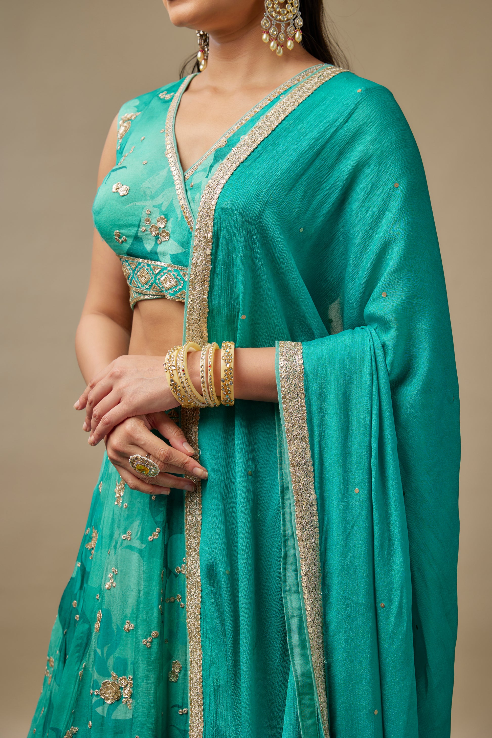 Featuring a turk blue lehenga in raw silk base with floral digital print and hand embroidery, including a can-can, side zip closure and side pockets. It is paired with a v-neck blouse and a chinon printed dupatta. Accentuate it with statement jewellery and heels for a wedding or sangeet ceremony.