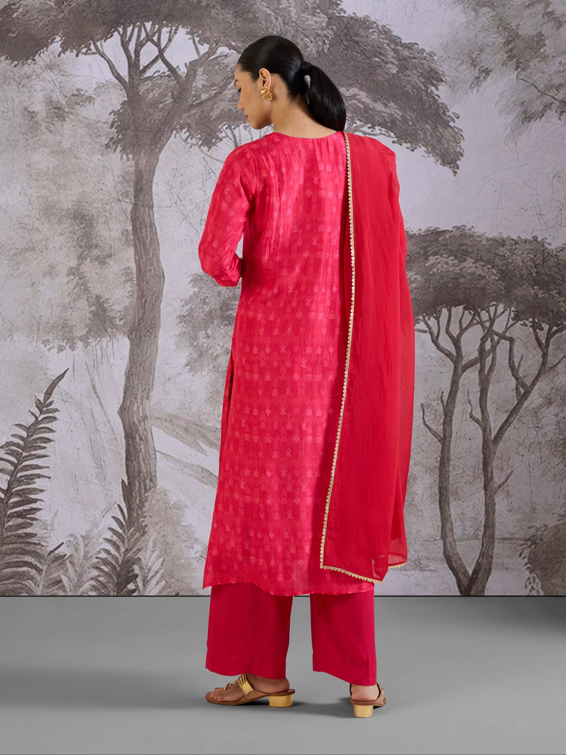 Pure jacquard Roxi Dupatta Set featuring rich prints and a classic silhouette. The kurta features a soft drape with a high–low hemline, relaxed sleeves, and a clean, minimal silhouette accented by a subtle embroidered motif near the shoulder for just a hint of embellishment. Paired with brocade-inspired wide-leg pants woven with delicate gold motifs, the ensemble blends simplicity with quiet luxury. Perfect for intimate festivities, summer soirées, or refined daytime events, this set offers comfort, sophistication, and effortless charm in one graceful look.