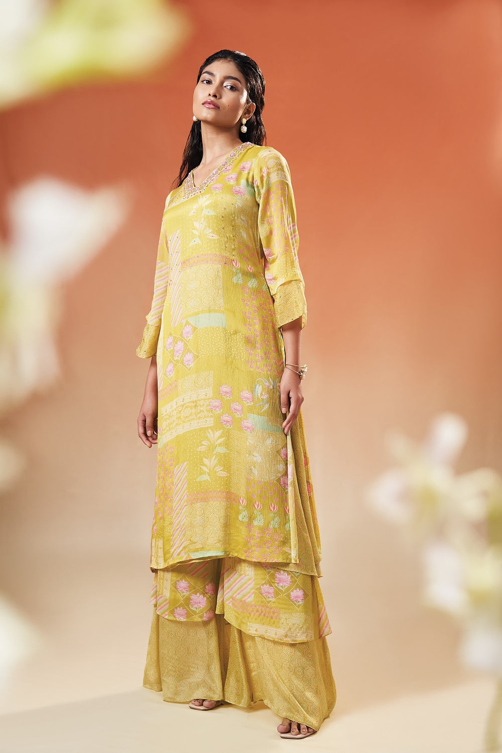 The Snapdragon Tunic set is made in chinnon fabric paired with complimenting flared pants. The delicate prints and artisanal hand embroidery effortlessly impart a refined yet effortlessly chic and dressy aesthetic.
