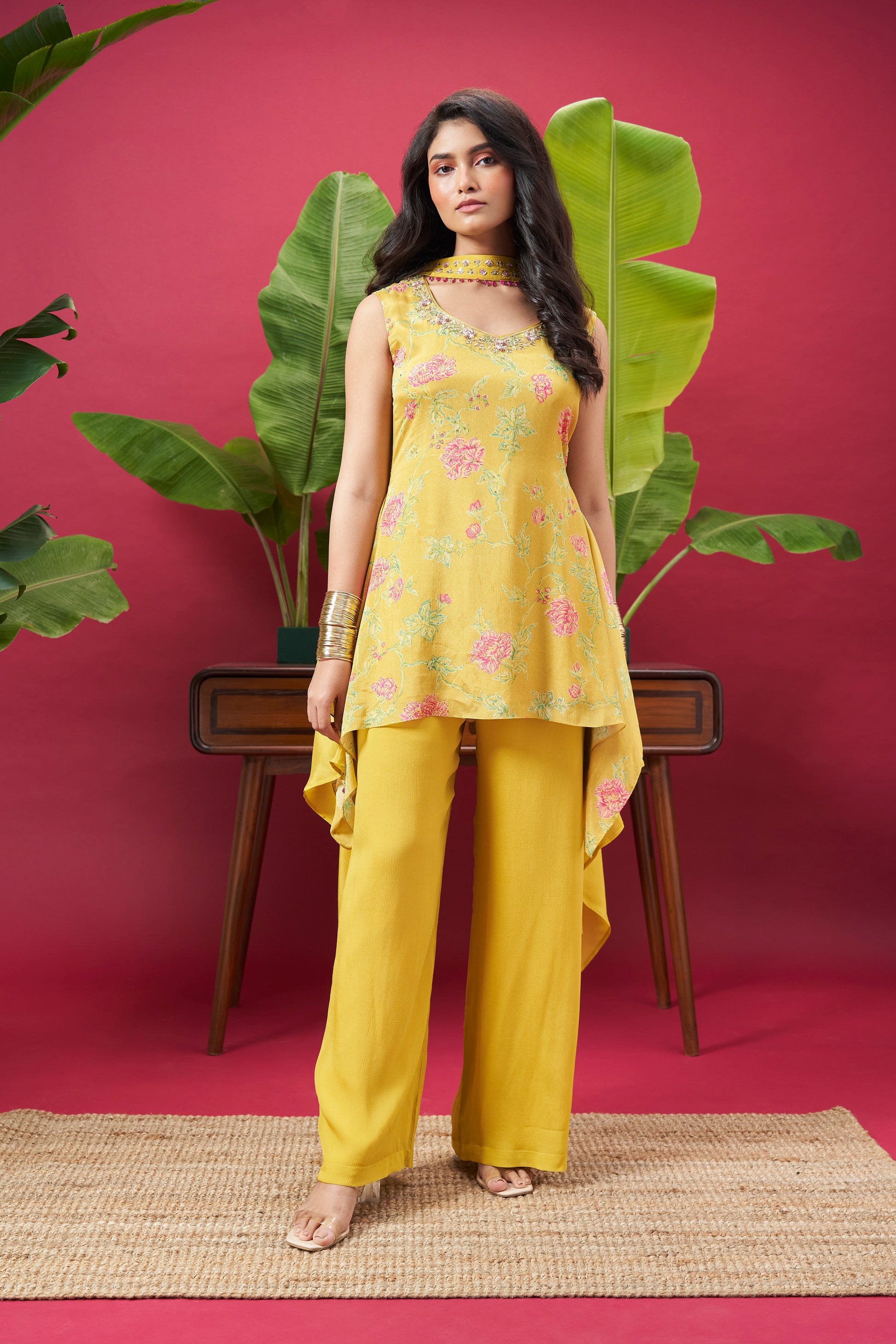 A Chinon drape top with crepe pants, accented with hand embroidery and embellishments. Effortlessly chic, perfect for festive occasions with a contemporary flair.