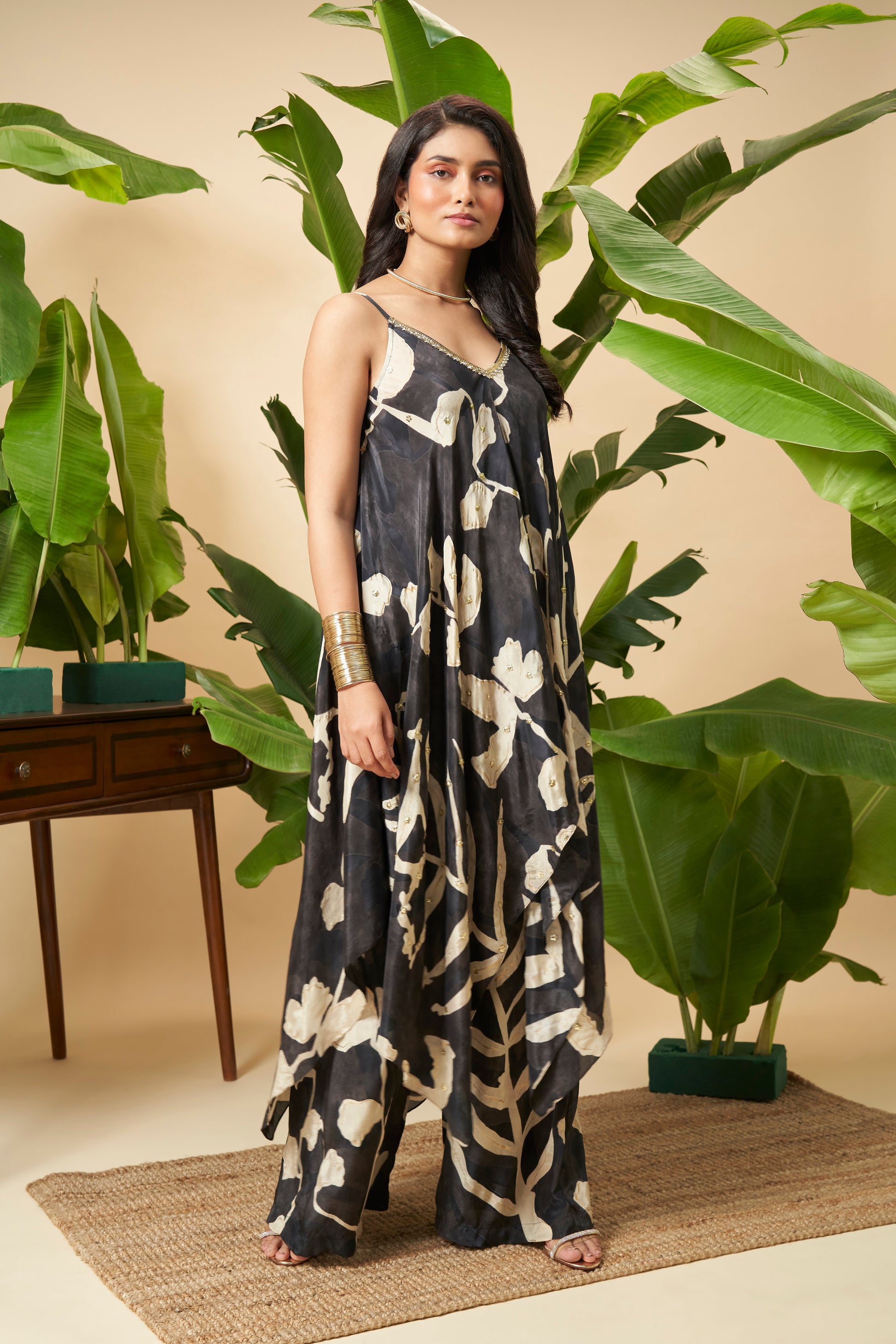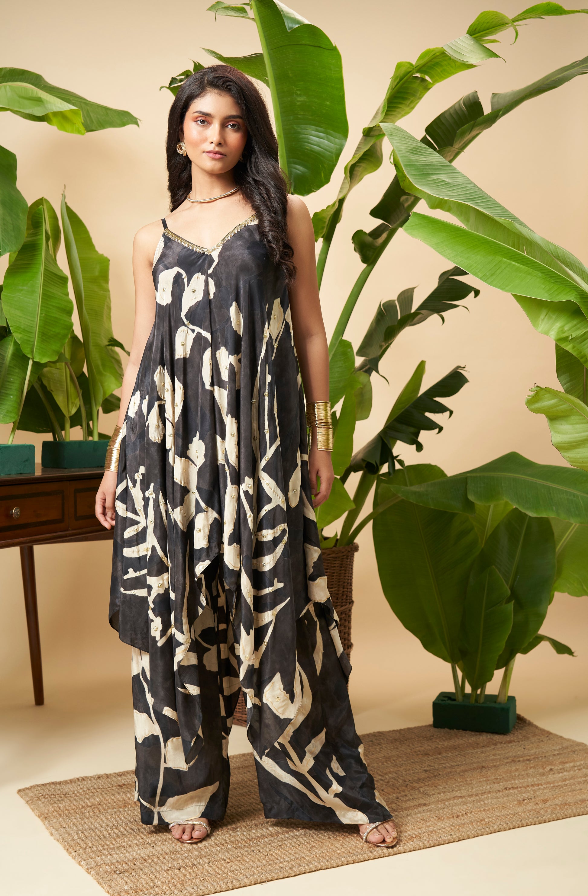 This pure crepe pant set, with embellished pants and top, offers a chic look for any festive event. A blend of style and comfort for a modern Indian aesthetic.