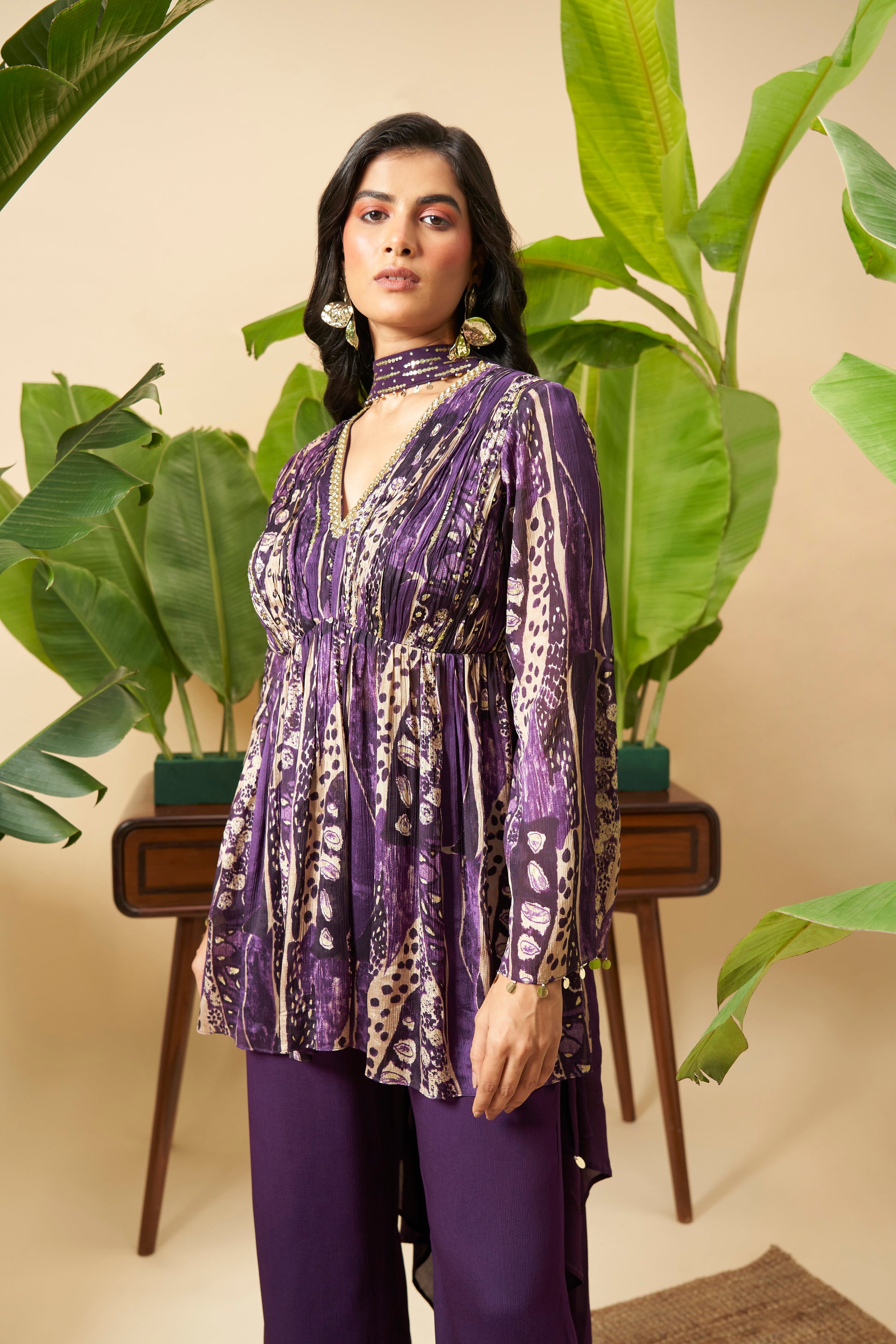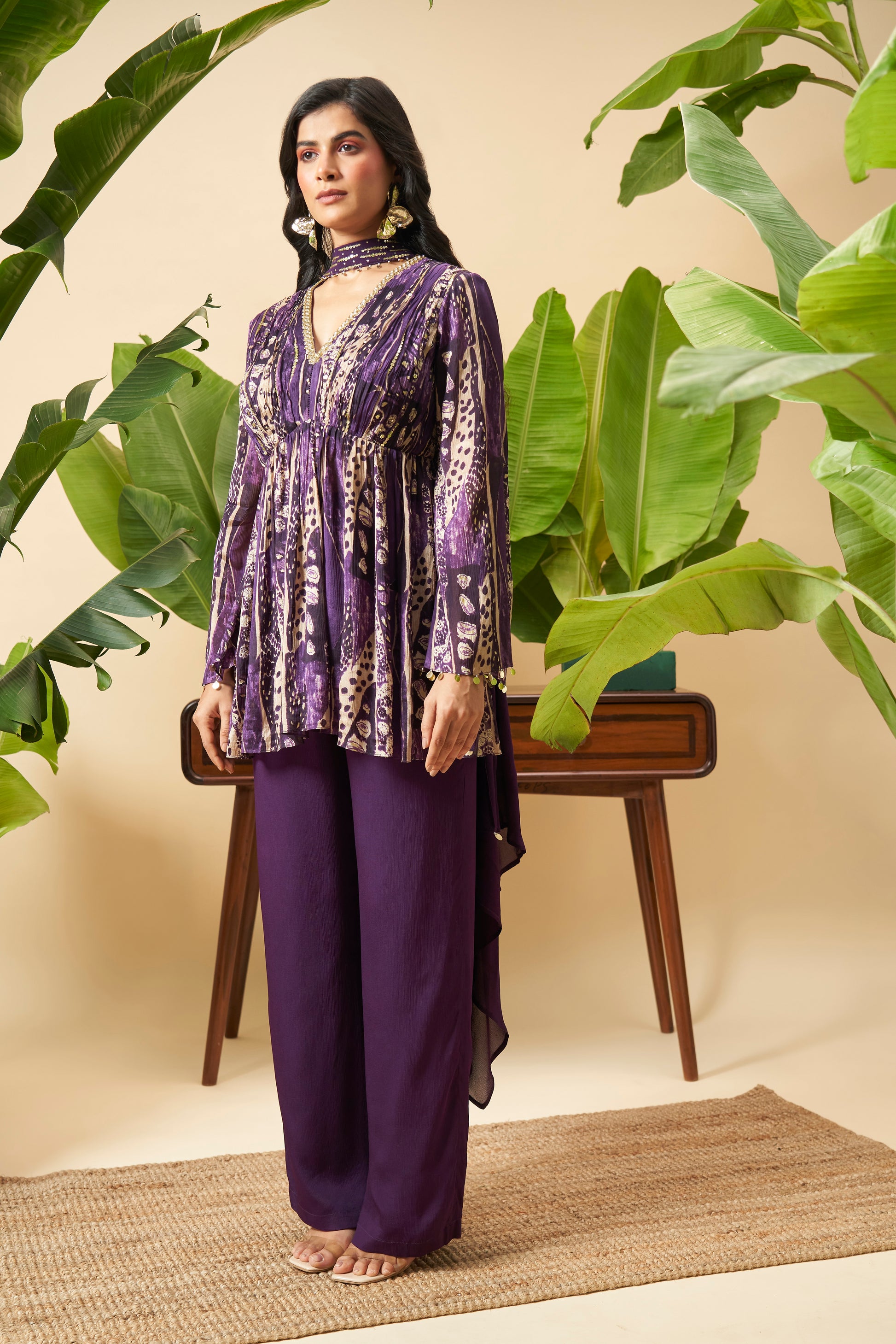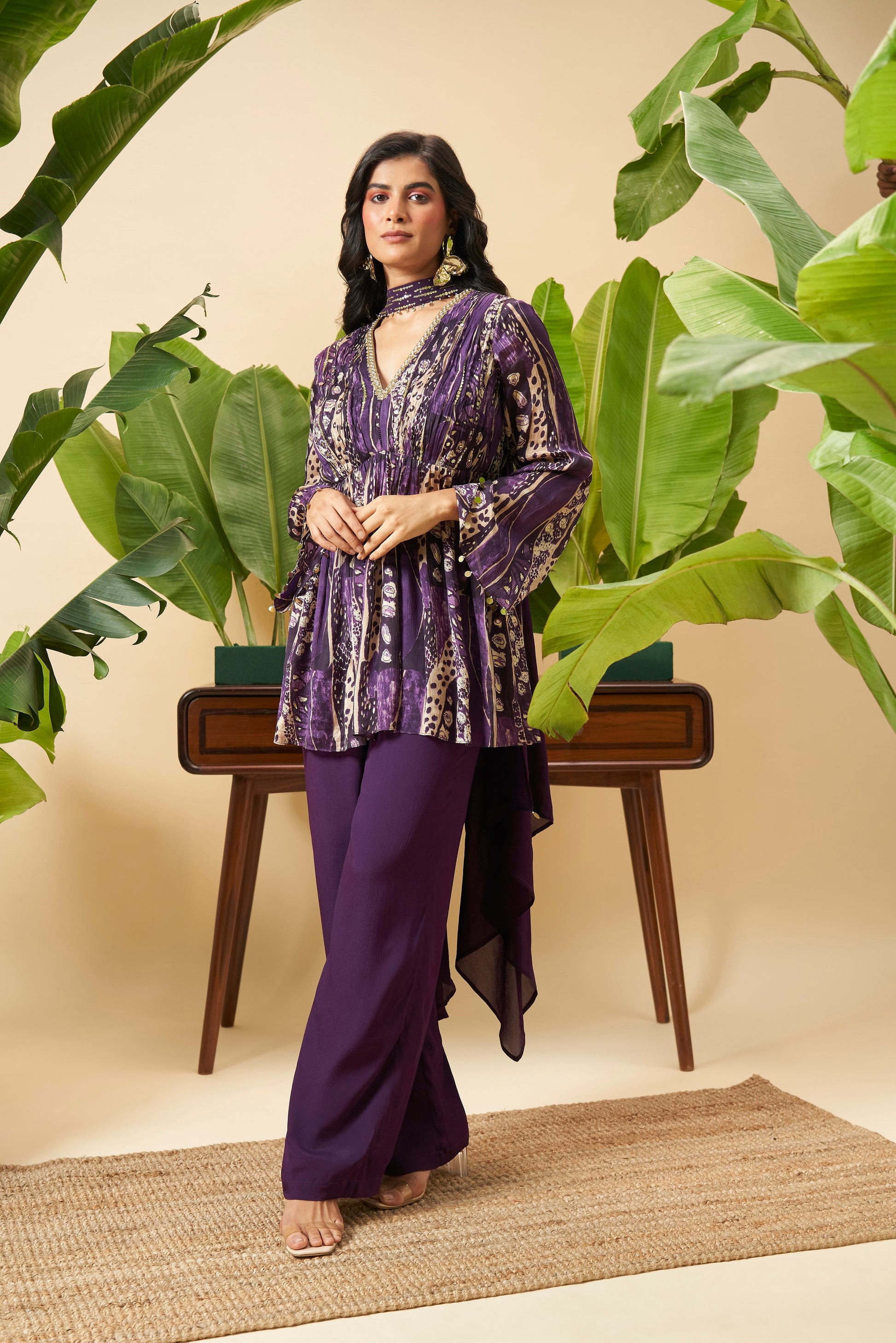 A Chinon drape top with crepe pants, accented with hand embroidery and embellishments. Effortlessly chic, perfect for festive occasions with a contemporary flair.